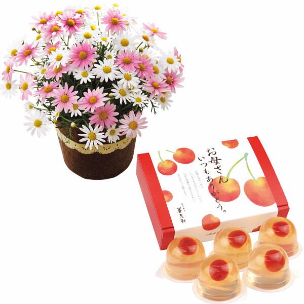 【母の日】山形県産さくらんぼのゼリーとマーガレット鉢植え5号のセット